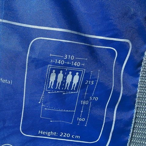 Telt med blå sider, to vinduer, hvidt tag med skrift i blå.: INGEMANN RACING. Brugt til motorsport. Gokart og formel bil