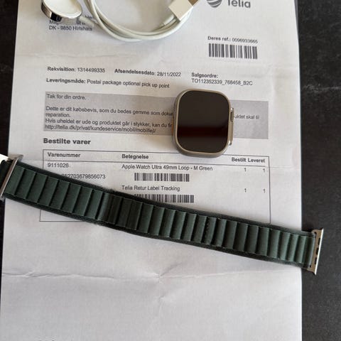 Apple Watch Ultra 49mm titanium ur med sort/gråt. Topmodel. Uret har en titaniumkasse og er designet til at være robust og holdbar. Modellen er A2684 og understøtter eSIM.