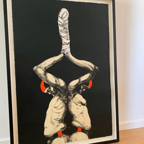 Værket er signeret og personligt dedikeret af Michael Kvium. Både motiv og dedikation er udtaget fra bogen og monteret i passepartout. Motivet dokumenterer en performance, hvor Kvium og Lemmerz ligger iscenesat døde på gulvet, mens en kvindelig figur afklæder sig – et stærkt og grænseafsøgende udtryk, karakteristisk for perioden og samarbejdet mellem de to kunstnere.