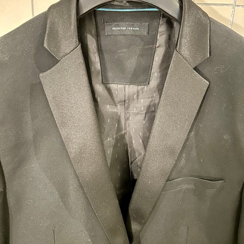 Sort smoking str XXL , jakke og bukser ser målene på billederne , de sidste billeder er likvide og længde på bukserne . Mærket Van Johnson. Næsten som ny. Se evt mine andre annoncer