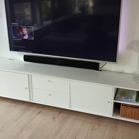 * Design: Lang, slank soundbar-lignende form, typisk monteret på væggen. Den har et lille display i midten, der viser kilde eller status