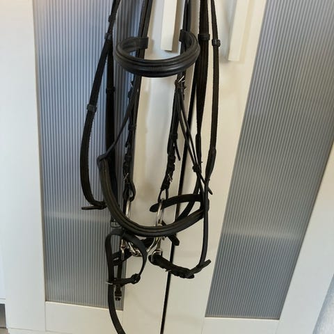 Trensen har stort set aldrig været brugt. Sort trense med engelsk næsebånd. Bridonbid str. 13,5 cm (målt fra inderside bidring til bidring)