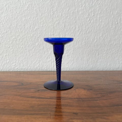 Smuk unik håndmalet lysestage med blåt blomstermotiv - signeret i bunden