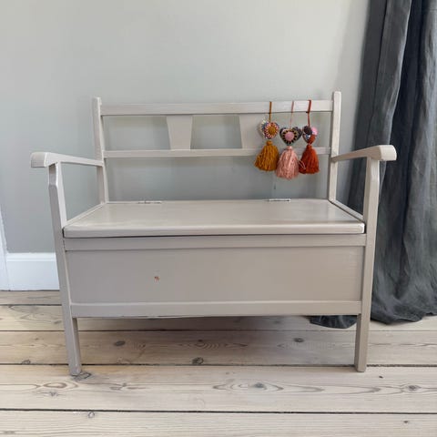 Den smukkeste klassiske Kaare Klint børnebænk. Bænken er malet i lys støvet blå udvendigt. Indeni er den mørkeblå og her er der god opbevaringsplads til legetøj, bøger mm. Den er robust og klar til mange års leg og brug🧸