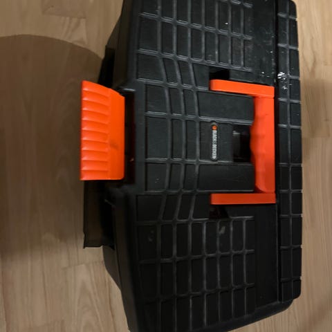 Black & Decker værktøjskasse i sort plast med orange låse. Indeholder et stort opbevaringsrum og en aftagelig bakke til mindre værktøjer og tilbehør.