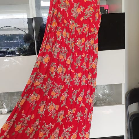 Kjolen med V-Hals, varme rødbrune farver dejlig let viskose kvalitet, lukkes foran med små fine knapper hele vejen, behagelig kjole med lange ærmer, elastikkant ved håndleddet. Mrk.: Zoey Designed In Denmark. 100% Viscose, size XS. Fashion has no size. BEMÆRK Målt: Brystvidde 109 cm. Kjolen vil kunne passe str. 40-42