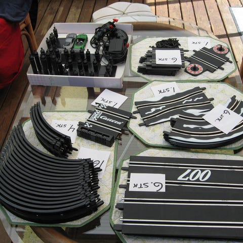 Racerbane, skinner, ukendt, 1 kassen med racerbanestik skinner og 3 biler 2 stik