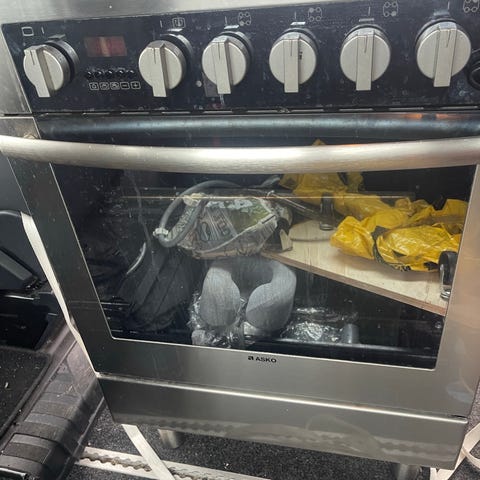 Beko gas komfur med fire brændere og ovn. Komfuret er hvidt og har betjeningsknapper foran. Inkluderer tilbehør som gasdyser og brugervejledning.