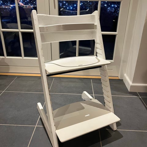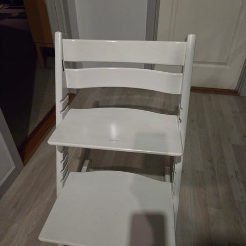 Tripp Trapp højstol i hvid. Justerbar stol designet til børn, som kan tilpasses i højde og fodstøtte for at følge barnets vækst.