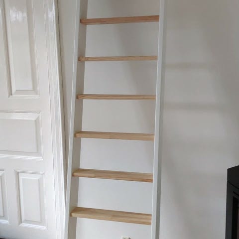 Det er en stor og solid hemsestige med gode, brede og tykke trin. Stigen fylder en del og er beregnet til at stå skråt.