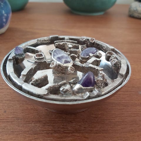 Skål, Potpourri bowl ( skål med låg ) fra 1960'erne i en slags metal / forsølvet sølv med halvædelsten. Skålen er stemplet men kan ikke tyde det samt indgraveret