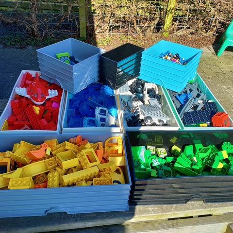 Blandet duplo Lego, hvor der bl.a. er en safari, et legehus og meget mere. De er i kasser á 57x40x33 cm, så der er meget Lego. Kasserne, den lyserøde dug (kan slåes ud, så man kan opbevare lego’et direkte i posen, uden at tage det ud hver gang) og den grønne plade medfølger.