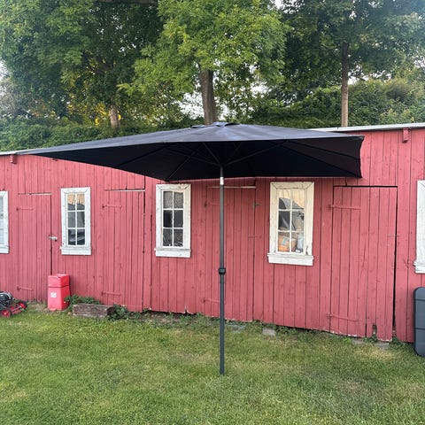 Ø160cm med hejs og mulighed for knæk. Virker upåklageligt, men er slidt i stoffet. Baserparasolfod (25kg) medfølger.