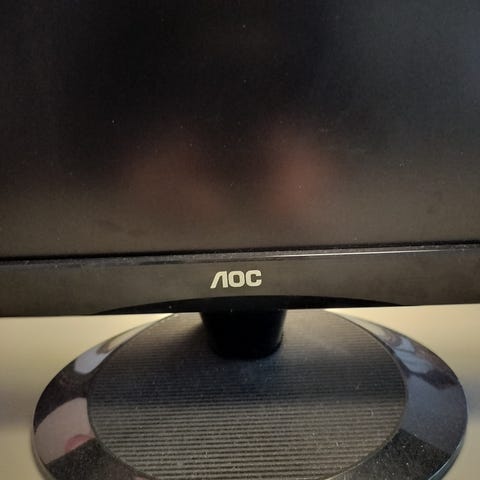 AOC 23" skærm med DVI- og VGA-tilslutninger. Skærmen har en sort farve og rund fod. Velegnet til almindelig computerbrug og kontorarbejde.