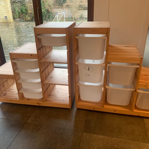 IKEA børnemøbel i træ med flere opbevaringsrum og hylder. Designet til børneværelser til organisering og opbevaring af legetøj og andre genstande.
