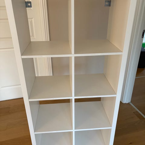 IKEA reol, Kallax i hvid højglans. Skuffe-indsatse medfølger ikke. Derfor er der synlig indvendige skruehuller. Ellers velholdt. Reolen er usamlet. Alle samle-dele, dybler og skruer medfølger.