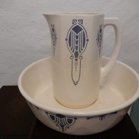 Fint gammel servante sæt i flødefarvet fajance og med rosa mønster.