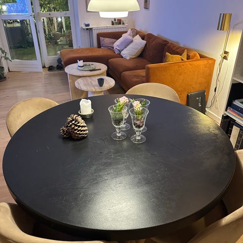 Snedkerlavet rundt spisebord, som ser stilfuldt ud. Godt håndværk. Kan nemt demonteres. Måler 112 cm i diameter, 68 cm i total højde, 65 cm i højden på ben. Der er flere overfladiske ridser, som kan slibes og overfladen kan lakeres så det bliver som nyt. Derfor sælges det billigt. Prisen kan dog diskuteres ved hurtig handel.