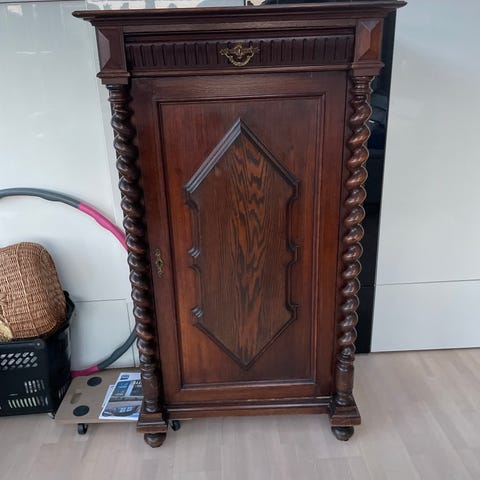 Skabet fremstår solidt og funktionelt, med almindelige brugsspor og aldersrelateret slid, som man må forvente af et møbel på 200+ år. Et karakterfuldt møbel, der passer perfekt i både ældre huse og moderne hjem med fokus på historie.