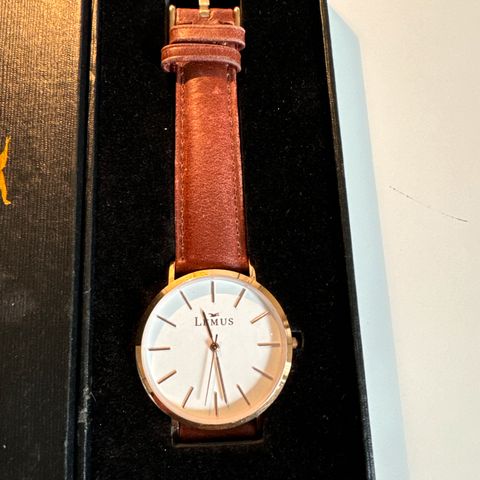 Lemus armbåndsur med cognac-farvet læderrem og rosaguld-detaljer. Urskiven er Ø4,5 cm. Remmen kan justeres fra 17-22 cm, den er 1,5 cm bred. Som nyt. Nypris: 1200kr Pris: 400k