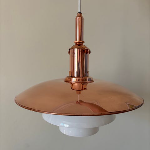 PH pendel, model 3½-3, limited edition i kobber, designet af Poul Henningsen og produceret af Louis Poulsen. I anledning af Poul Henningsen 120 års fødselsdag. Blev kun produceret et vist antal i Maj 2014. Lampen er fremstillet i kobber med to underskærme af hvid opal glas. Der medfølger også en overskærm i hvid opal glas med. I original kasse til den.