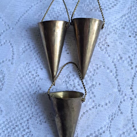 2 hyggelige gamle messing kræmmerhuse til at hænge op på væggen og pynte med gran og diverse pynt. Højde uden ophæng er 20 cm og 8 cm i diameter foroven. PRIS PR. STK. kr. 45,-