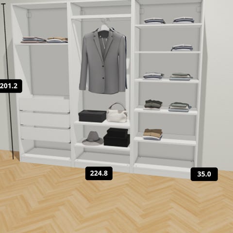 Ikea Pax garderobesystem bestående af fire sektioner med hylder, skuffer smykke hylde og helt nye glasplader Mål: Højde 201 cm, bredde 52,5 cm på hjørne skaberne og 50 cm bred på den i midten og 100cm for den store af dem. D: på alle er 58 cm. Systemet inkluderer hængestang til tøj samt flere opbevaringsmuligheder til organisering af tøj og tilbehør. Når det hele er samlet så er den 263cm bred.