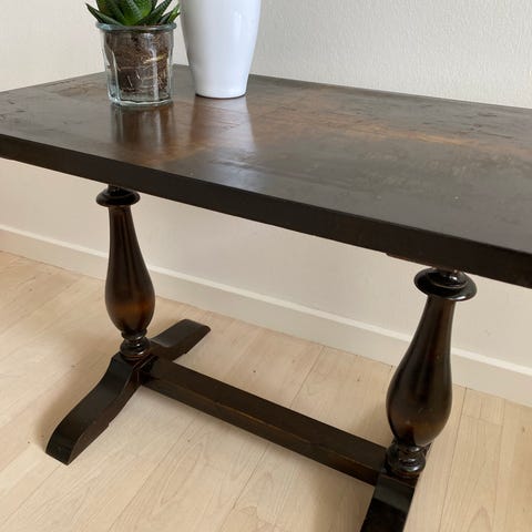 Vidunderligt bord til stuen. Tungt fordi det er af hoj kvalitet. Overfladen kan sandsynligvis lakeres. Der er mærker pà overfladen, fordi bornene kunne lide at tegne pa det. Mal længde 135, bredde 86, hojde 52