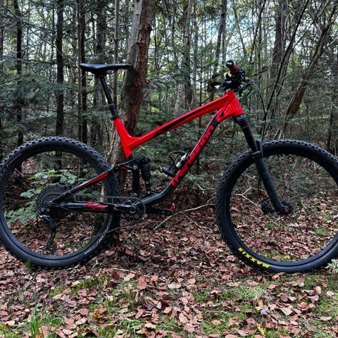 Giant Full Suspension cykel. Cyklen har fuld affjedring, hvilket giver bedre kontrol og komfort på ujævne underlag. Den er egnet til forskellige terræner og formål.
