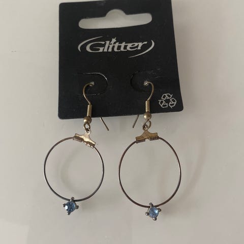 Håndlavede hængende øreringe med små lyseblå perler og et blåt hjerte. Længde ca 4,5 cm.