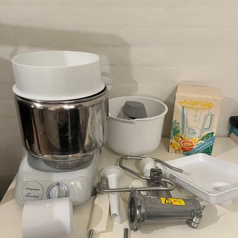 Electrolux Assistent røremaskine med stor rustfri stål skål, plastskål, kødhakker, piskeris, dejkrog, dejskraber, opskriftshæfte.