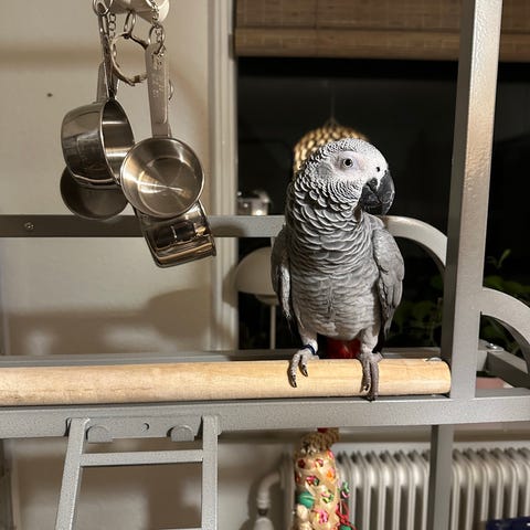 Håndtam grå jaco på 6 måneder er klar til nyt hjem. Den er håndopfodret og derfor vant til hænder. Medfølger bur, legetøj og mad