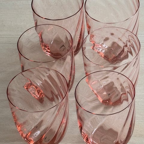 Anna Von Lipa Swirl håndlavet 6 glas og kande, lyserød, samlet pris, NYT