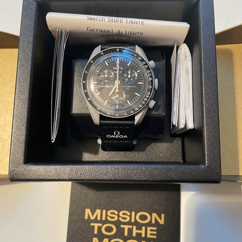 This chronograph features a navy Bioceramic case, crown, and pushers, paired with a matching navy rubber strap Introducerer oktobers Mission to Earthphase – Moonshine Gold, den tredje kronograf i serien.