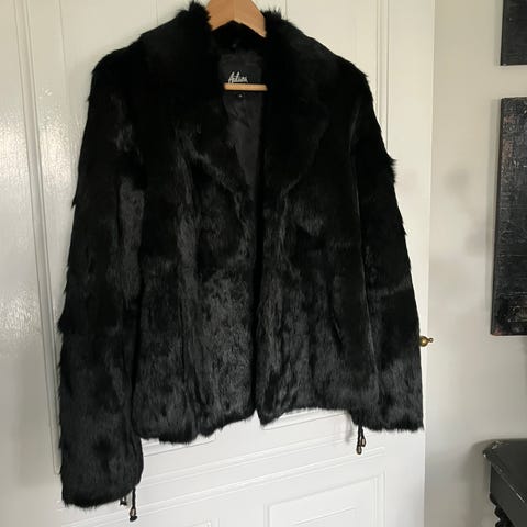 Kan bruges til festbrug over kjole da den ikke er foret- perfekt til f.eks. nytåret. Den er sort og glider nederst over i grå.