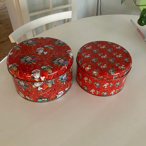 God Jul køkkentøj dåser med julemotiv. Dåserne er lavet af metal og har en blågrå farve med dekorative kranse og teksten 'God Jul'. Indvendigt er dåserne guldfarvede. Passer til opbevaring af tørre fødevarer eller småting i køkkenet.