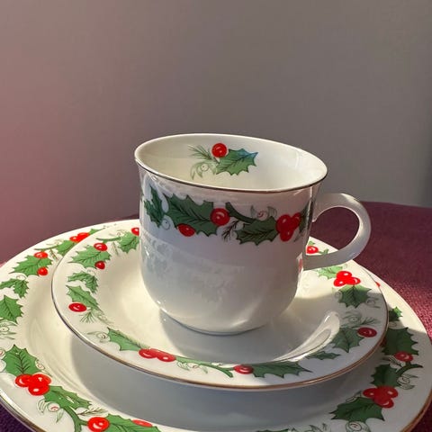 Julestel kaffekopper og tallerkener med julemotiv i rød og grøn. Sættet indeholder kopper, små og store tallerkener samt sukkerskåle. Materialet er porcelæn.