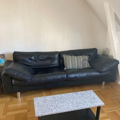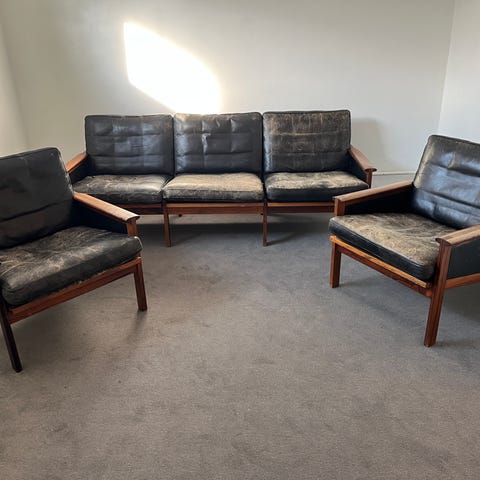 Sofaen har originalt sort/brunt læder med tydelig patina og brugsspor, som passer til alderen. Ingen gennemgående revner, men almindeligt slid og rynker. En enkelt pude har lille hul - dog på undersiden, så det er ikke synligt.