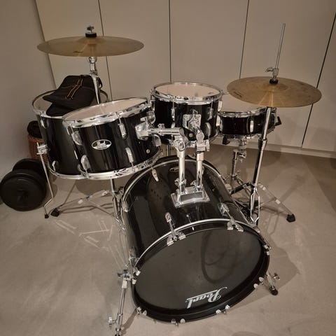 Compact drum kit with an 18" bass drum and 10" snare drum.