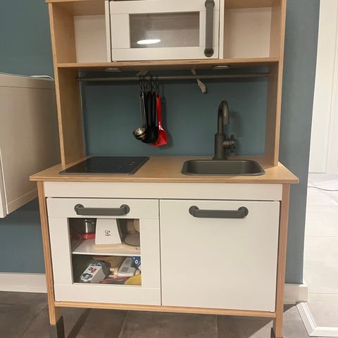 IKEA børnekøkken i træ med hvid og naturfarvet finish. Køkkenet indeholder ovn med gennemsigtigt vindue, kogeplader, hylder og kroge til opbevaring af køkkenredskaber. Egnet til børn til leg og læring.