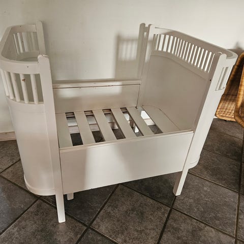 Sengen fremgår med synlige brugsspor og er malet i hvid.