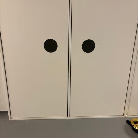 Det ene skab har et oversavet ben på et af bagbenene, som er lappet med tape. Men det står fint på trods (se billeder).