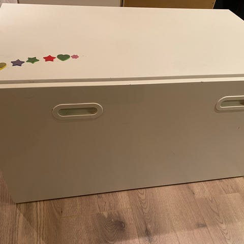 IKEA Småstad bænk med legetøjsopbevaring. Opbevaringskasse på hjul til at trække ud. Designet til opbevaring af legetøj eller andre genstande i børneværelset. Står rigtig fint med minimale brugsspor.