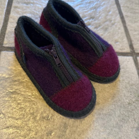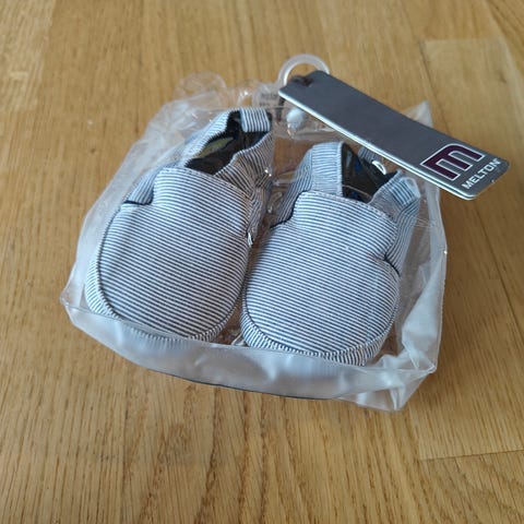 Melton futter med brune og beige striber. Nye, ubrugte og de kommer fra et røgfrit hjem. Hjemmeskoene har en snøre om anklen, der kan justeres med et trykspænde, og under bunden er der små gummidupper, der gør dem mere skridsikre. Indersiden er foret med blødt fleece. Skoene måler ca. under sålen 14,5 cm.