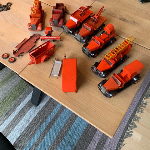 Tekno brandbil legetøjssæt bestående af flere røde metal brandbiler og tilbehør. Sættet inkluderer forskellige typer brandbiler såsom stigevogne, tankvogne og redningskøretøjer. Egnet til samling