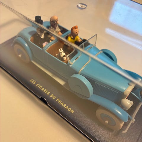 Modellen viser Tintin, Terry og Kaptajn Haddock i en rød Triumph Herald, der trækker en campingvogn.