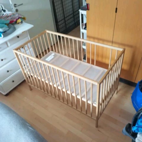 Flot og velholdt tremmeseng sælges. Næsten ikke brugt og fremstår som ny. Plet på madras, men kan sagtens vaskes af.