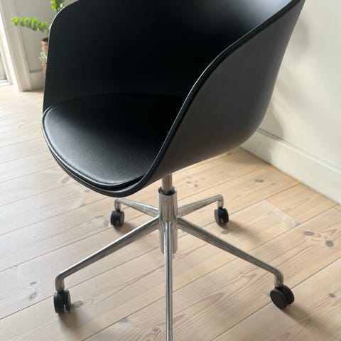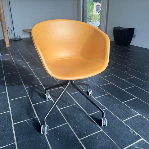 Patineret kontorstol i cognacfarvet læder med sort stel og hjul. Fungerer upåklageligt.