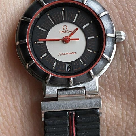 Flot Omega fra cirka år 1984 i et usædvanligt design (Spider Web) Urkassen måler 26 mm. Dato funktion klokken 6. Monteret med den originale Omega gummirem og spænde. Uret har fået nyt batteri hos Christoffersen Guld-Sølv og Ure. Passer håndled op til 19 cm. Særdeles velholdt med mindre brugsspor. Uret går perfekt. Min hustru ved allerede nu, at hun får et nyt ur i julegave, så du kan overtage denne skønhed billigt. Sælges til langt under markedsprisen. Til dig som tænker du vil underbyde, så glem det. Det er allerede billigt, bud besvares ikke. Kan afhentes i Odense eller sendes med DAO for 45 kroner. Sælges IKKE som fiks og færdig. Telefon 71701243