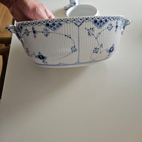 Royal Copenhagen suppe terrin med låg. Skålen har et dekorativt mønster og en låg med en ornamentdetalje. Produktet er lavet af porcelæn med en creme farve og guldkant.